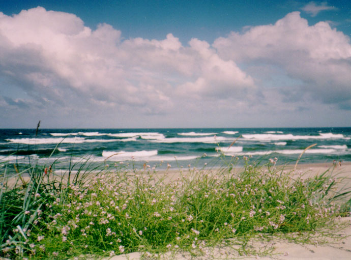 Jūra kasdien maino savo veidą. Per audrą ji pajuosta, o iškilusios bangos pasidabina žaliom keterom. Visai kaip toje pasakoje apie žvejį ir jo pačią. Eidamas toliau per tą vėjų palenktą mišką, pasieki apžėlusias kopas; čia jau ir Baltijos paplūdimys, tokios Baltijos, kokios iki šiolei dar nepažinojau. Ji plačiausiai veriasi į vakarus. Iki pat Švedijos. Čia, kaip ir Šiaurės jūroje, pučiant vakarų vėjui smarki bangų mūša. Ši mūša kupina savotiškos didybės. Ir jūra, ir paplūdimys čia irgi primena pirmykštę, primityvią gamtos stichiją. Aš kartais pamanau, kad jūra, lygiai kaip ir snieguoti aukštikalniai arba dykumos, - savarankiškos gamtos reiškinių kategorijos. Kas jūrai neparodo deramos pagarbos, gali ir gerokai nukentėti. Netgi pačiame pakraštyje bangos turi dar tiek jėgos, jog rodosi, lyg liūto letenos vožčiotų per pečius.