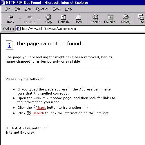 Šis pranešimas reiškia, kad puslapis panaikintas, pervadintas arba yra laikinai neprieinamas. Peržiūrėję visus interneto katalogus, niekur neradome informacijos, kad TS (LK) partija būtų pakeitusi savo tinklapio vardą. Nuo ketvirtadienio popietės iki pirmadienio ryto, t.y., liepos 13 17 dienomis Lietuvos interneto lankytojai buvo be informacijos apie valdančiosios partijos veiklą , aktualijas ir ateities planus. Dabar tinklapis jau funkcionuoja normaliai, tačiau e-Vėjas taip ir nepučia. Viename iš pagrindinių puslapių, aiškiai matomoje vietoje, įdėta nuoroda į e-Vėjo programą, o ten Puslapis nesurastas (liepos 20 d. informacija)